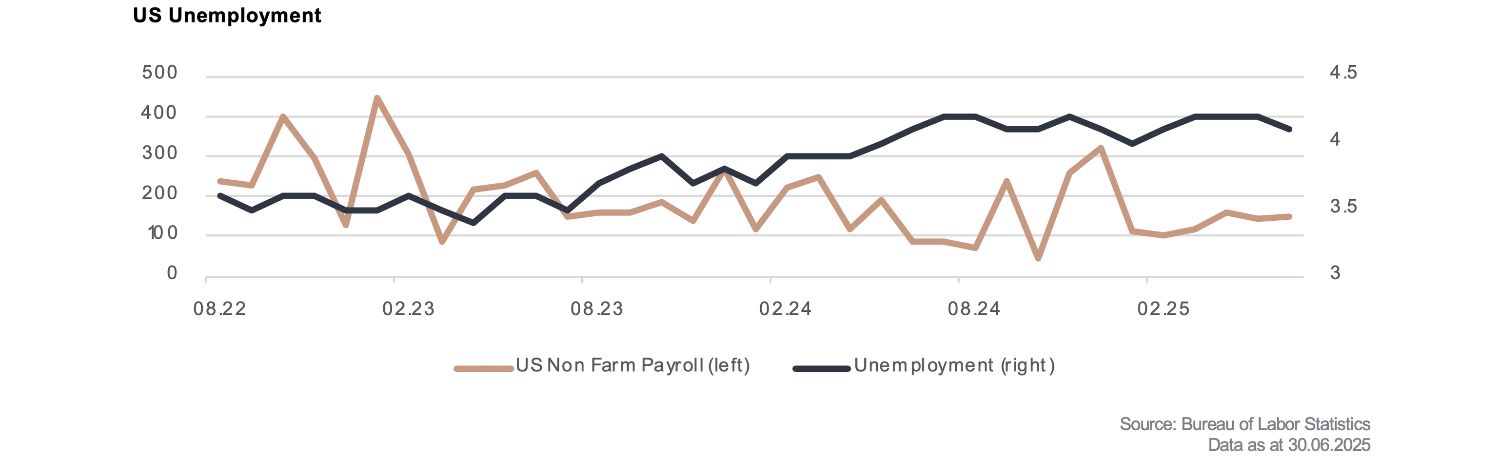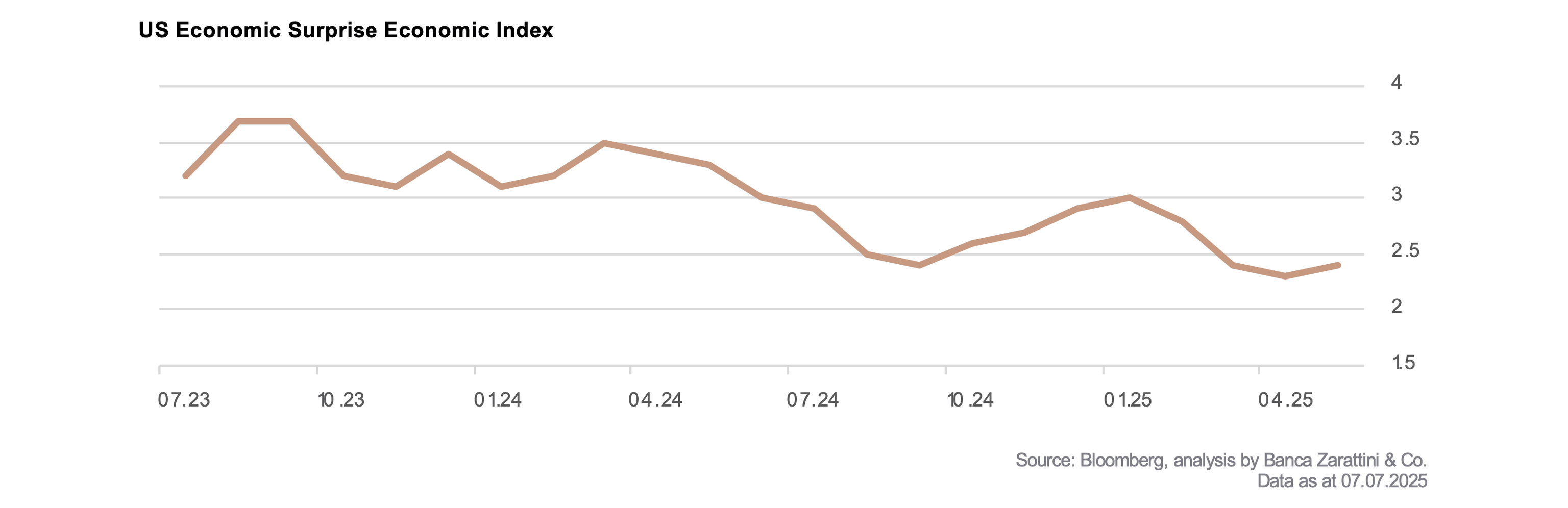Indeed, annual inflation growth remained at around 2.4% in May, down from 2.9% at the end of the year, and employment indicators remained stable. This confirms the substantial resilience of the US economic cycle and suggests that the impact of this regime change will be difficult to identify. While some initial indicators suggest a cooling phase in the cycle, these are within the normal parameters of variability and are also distorted by the front-loading effect of the first quarter. While it is therefore difficult to ascertain the true robustness of the macroeconomic data with certainty, there are certainly no signs of a recession, which can be ruled out for now.